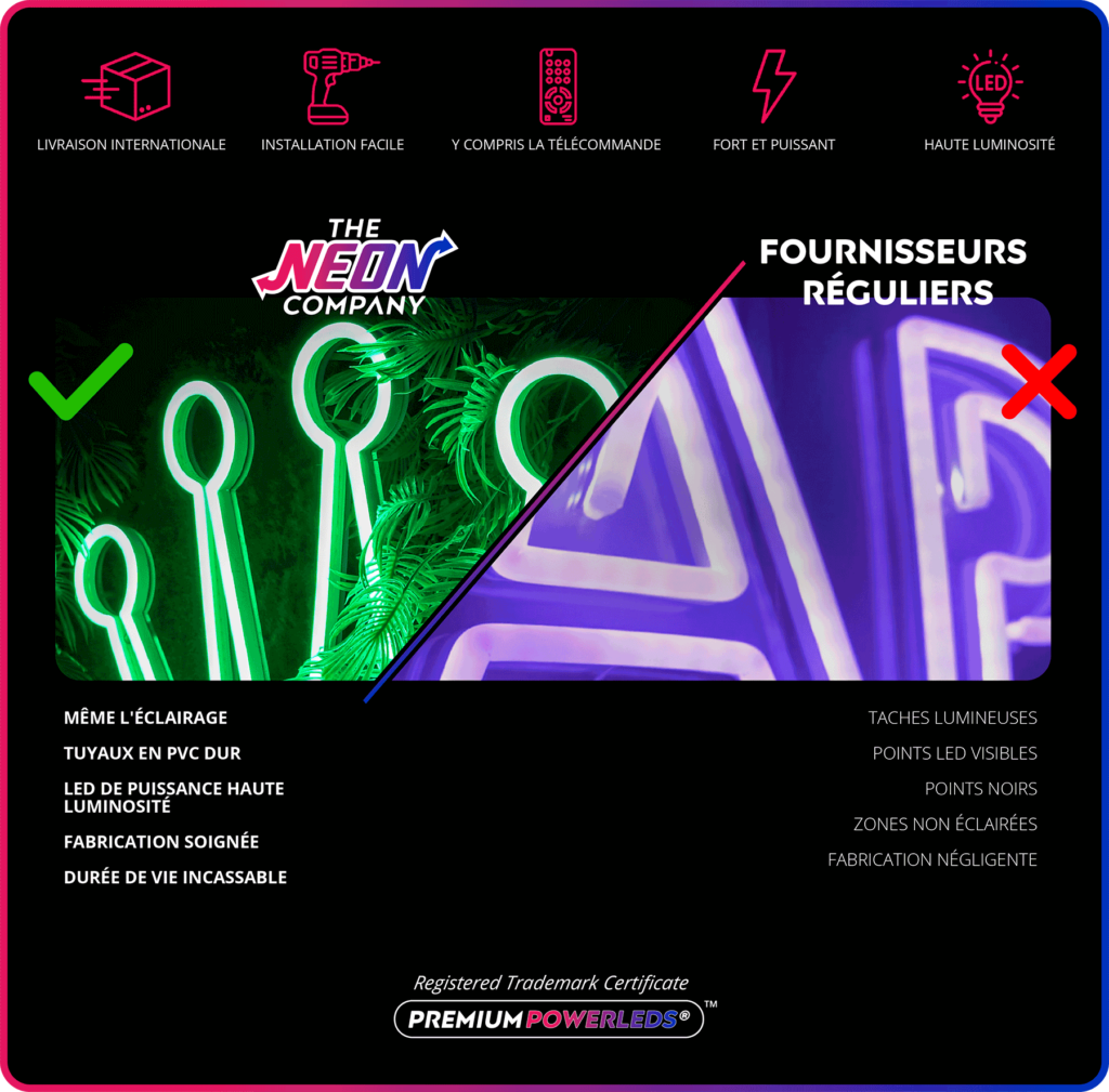 Les spécialistes du néon de The Neon Company sont disposés à transformer le nom de votre entreprise, votre logo ou votre marque en éclairage au néon d’une manière atmosphérique et puissante. Grâce à notre clientèle de plus de 5000 entreprises et marques connues, vous êtes au bon endroit pour trouver une Enseigne Lumineuse durable au prix le plus bas garanti.